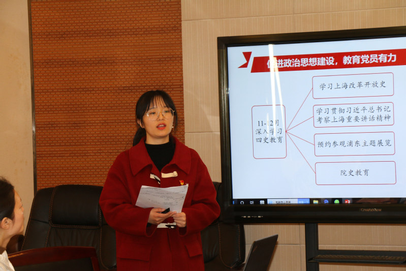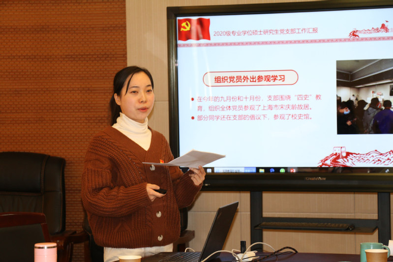 2020级专业学位硕士研究生党支部书记葛灵如围绕思想建设和组织建设汇报了工作情况。她提到,在组织党员开展学习的过程中,支部存在党员学习积极性不高,个别党员学习懈怠的情况。面对这个问题,下一步她计划开展“五人学习小组”、“读书分享会”等活动来提升党员对于理论学习重要性的认识。