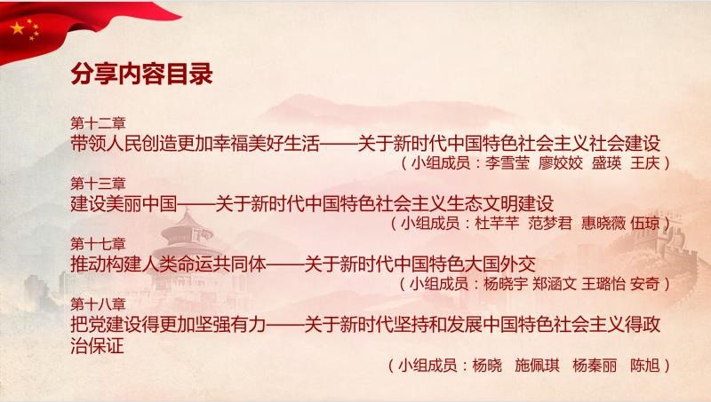 h动漫 2019级硕士研究生安奇汇报了学习小组对《习近平新时代中国特色社会主义思想学习纲要》的学习感想。他介绍了习近平新时代中国特色社会主义思想中关于国际关系、国际合作以及全球治理的理念,然后从新冠肺炎疫情的现实角度来探讨人类命运共同体、“一带一路”国际合作和全球治理体系,他认为,通过深入学习习近平新时代中国特色社会主义思想,同学们更能体会到中国在不断发展强大的过程中,致力促进各国共同发展,展现出了大国担当。