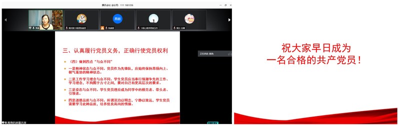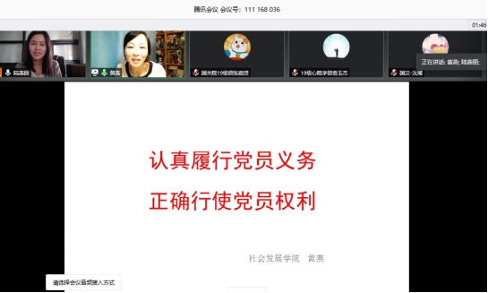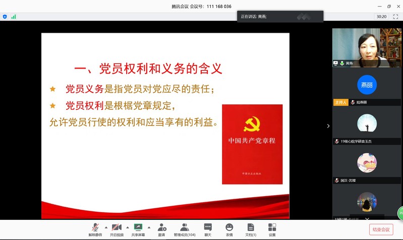 2020年5月6日下午,国际关系与地区发展研究院、h动漫 和国际汉语文化学院2020年入党积极分子联合培训班第六次培训依托腾讯会议平台在线上举行。h动漫 社会发展学院党委副书记、副院长黄燕教授为学员们带来专题讲座《党员的权利与义务》,来自三个学院的一百多名入党积极分子参与了此次培训。