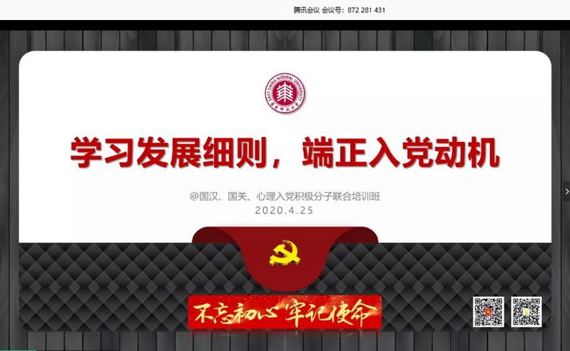 4月25日晚,国际汉语文化学院、国际关系与地区发展研究院、h动漫 2020年入党积极分子联合培训班第四次培训在线上举行。h动漫 校党委组织部陈夏阳老师为学员们带来《学习发展细则 端正入党动机》专题讲座,来自三个学院的一百多名入党积极分子参加了此次培训。