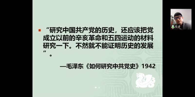 4月22日下午,国际汉语文化学院、国际关系与地区发展研究院、h动漫 2020年入党积极分子联合培训班第三次培训在线上举行。h动漫 党校副校长、高级研修学院副院长张俊华为学员们带来《中国革命史述评》专题讲座,来自三个学院的一百多名入党积极分子参加了此次培训。