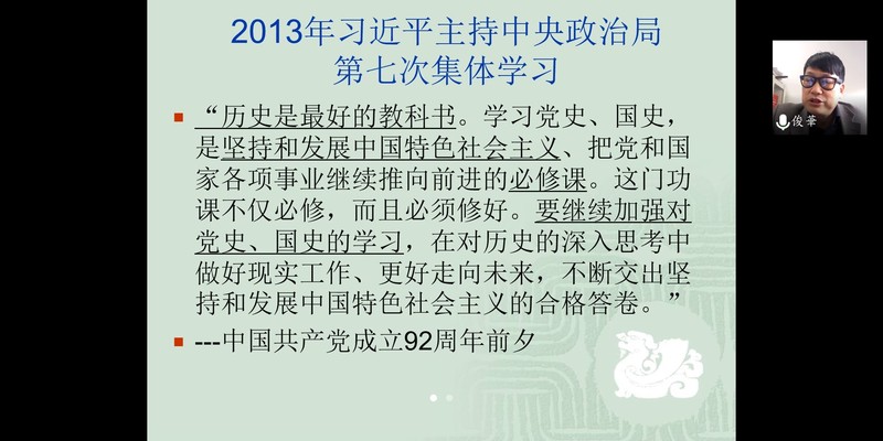 2020年到未来的奋斗史阶段是我们“应接续的使命”。张俊华老师向同学们提出三点要求:一是坚定共产主义信仰;二是践行社会主义核心价值观;三是成为德智体美劳全面发展的社会主义建设者和接班人。共产党员应当起到先锋模范作用,积极入党的同学们也应当严于律己、以身作则,即便是疫情在家期间也要对自己有严格的要求,坚定信仰并为之奋斗。