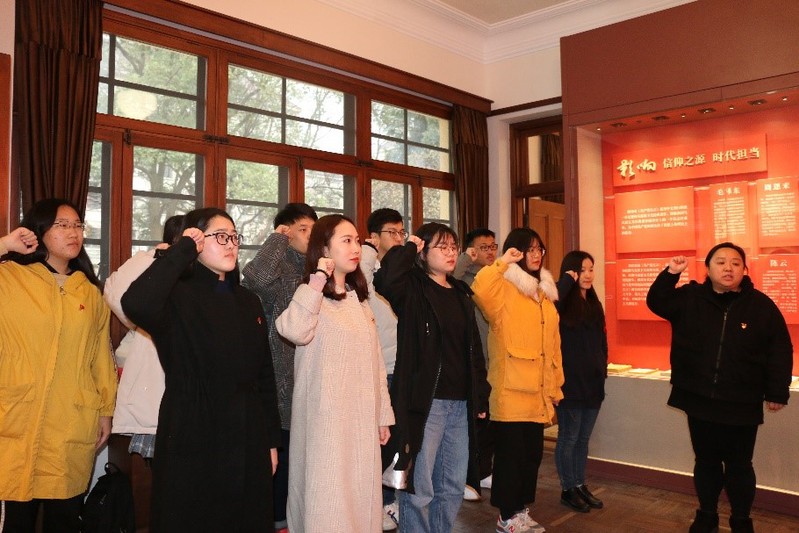 2018年2月27日下午,h动漫 党委组织学院青年教师代表和学生党员赴《共产党宣言》展示馆(陈望道旧居)参观学习,并举办学生预备党员入党宣誓仪式,探寻信仰之源,汲取奋进力量。