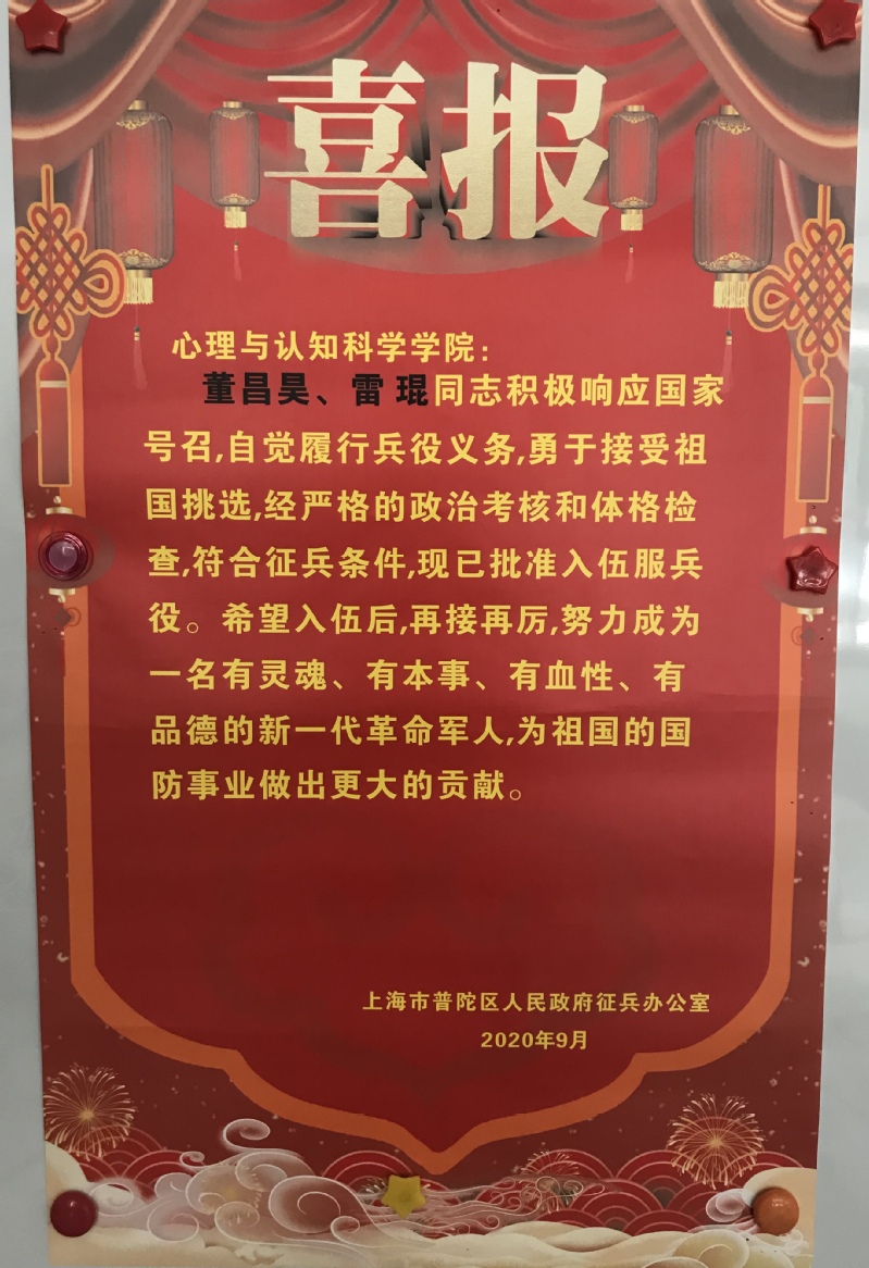 h动漫 2018级心理学大类本科生董昌昊、2019级应用心理学系学术型研究生雷琨积极响应国家号召,自觉履行兵役义务,勇于接受祖国挑选,经过严格的政治考核和体格检查,符合征兵条件,获得批准入伍服兵役。特此祝贺!董昌昊和雷琨董昌昊、陶洁(辅导员)和雷琨