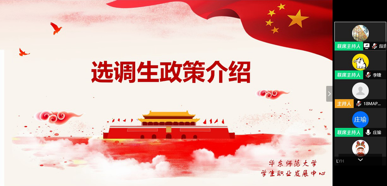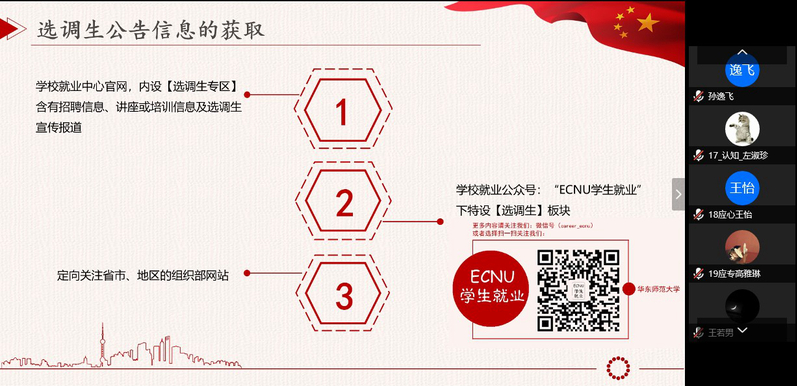 3月28日,h动漫 通过腾讯会议在线举办了“选调生政策解读与经验分享沙龙”。本次分享会邀请了我校学生职业发展中心市场信息部主管段言老师和2018级MAP吴莹同学(已入选浙江省选调生)作为嘉宾,为同学们解读选调生政策,分享基层就业经验,七十余名同学参与本次活动。