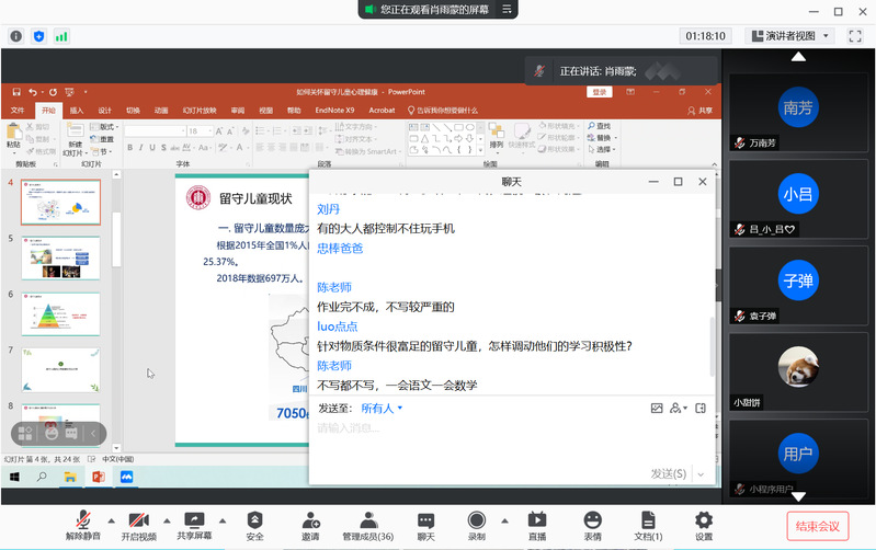 调研后期,“心希望”团队面向当地辅导员教师和家长开展了以“如何关怀留守儿童心理健康”为主题的讲座,针对在调研过程中发现的留守儿童自卑、欺凌和侵害、手机沉迷以及规则意识淡漠等问题提出了对策建议,教师和家长也在讲座后进行了热烈的交流互动。