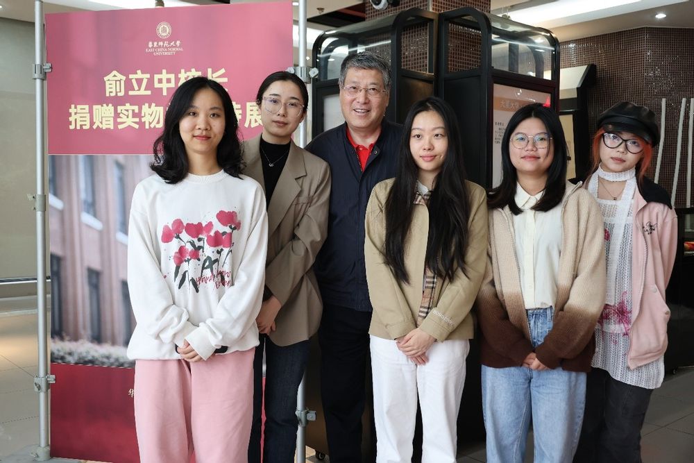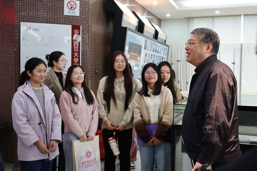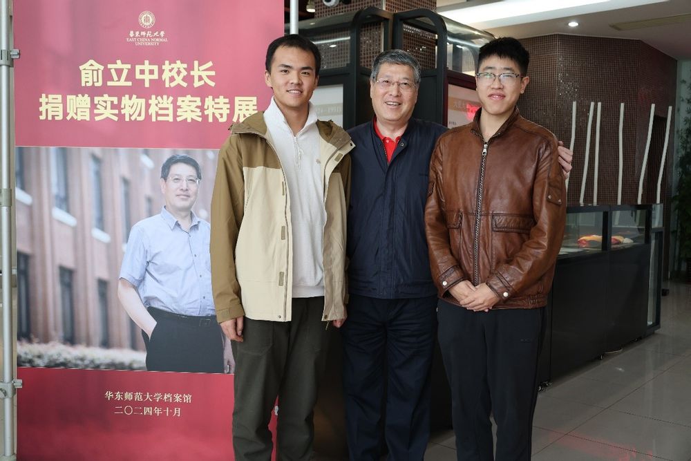 捐赠仪式后,同学们来到档案馆一楼展厅,参观俞校长捐赠实物档案特展。俞校长和同学们亲切交流,合影留念。他表示,无论是过去还是现在,他都希望能与同学们保持紧密联系,“坐一张板凳、吃一桌饭菜”,了解同学们的生活与学习情况,与同学们分享自己与华东师大的美好故事。