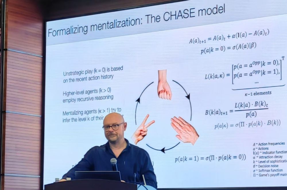 Christian Ruff教授首先从历史发展的角度,系统回顾了心智化能力评估方法的演进历程,从Baron Cohen等人1985年开发的经典心理理论测量范式,到Castelli等人2002年提出的改进范式,再到基于Hampton等人2008年提出的递归推理计算模型框架,展现了该领域研究在理论与方法上的不断革新。随后,Ruff教授进一步阐述了当前心智化能力评估模型的局限性,并详细介绍了其团队开发的CHASE(认知层级评估)模型在研究方法上的突破性贡献。其团队将该模型应用于研究自闭症群体社会适应功能不良的认知神经基础,为改进和完善自闭症等精神和心理障碍的诊断方法与干预措施提供了坚实的理论与实证基础。互动环节中,师生们就心智化水平的测量与建模、计算模型的具体实现以及数据分析等方面的问题与Ruff教授展开了热烈讨论和深入交流。